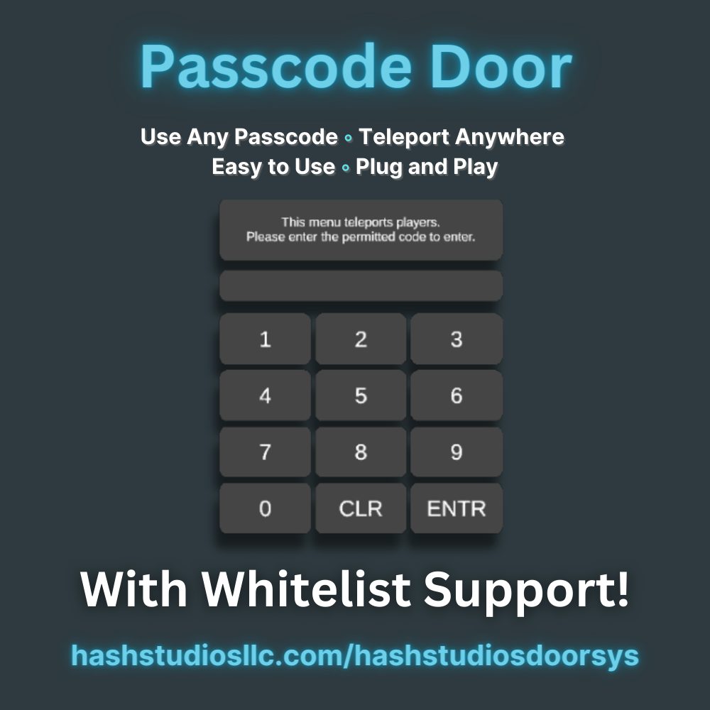 Hash Studios DoorSys is a sleek, user-friendly UdonSharp prefab that offers creators the ability to set custom passcodes and create whitelists, ensuring your virtual reality worlds remain secure and accessible to those you choose.