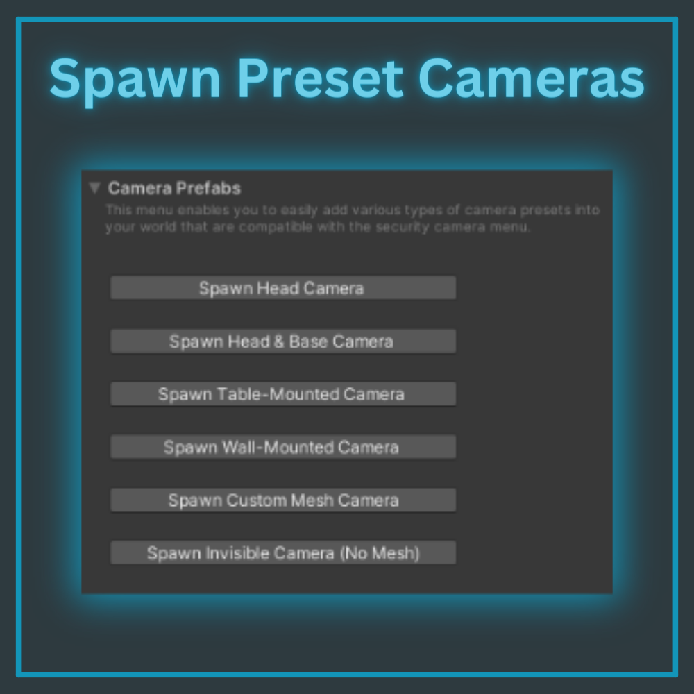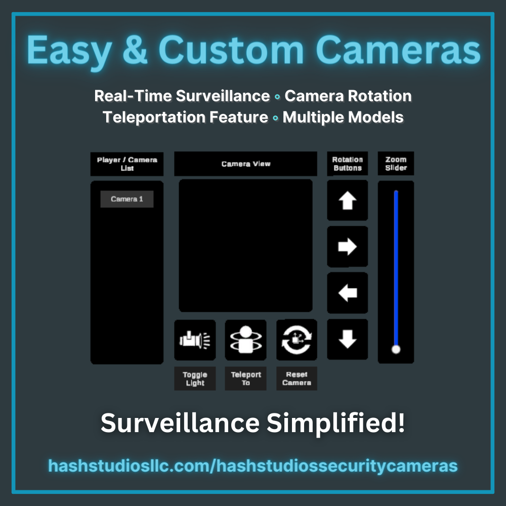 Hash Studios Security Cameras is a Udon Unity prefab offering a comprehensive camera system for VR world creators.